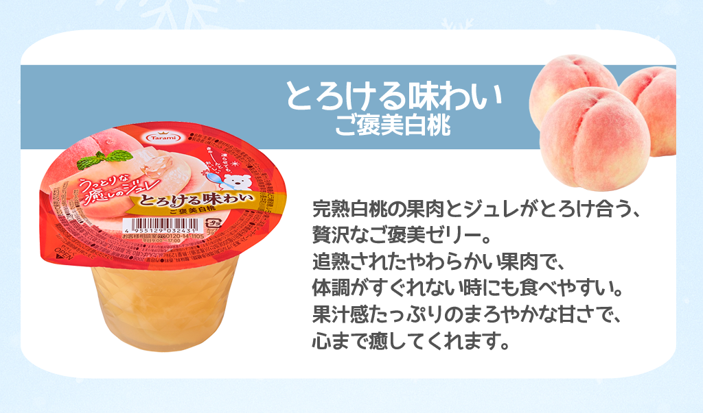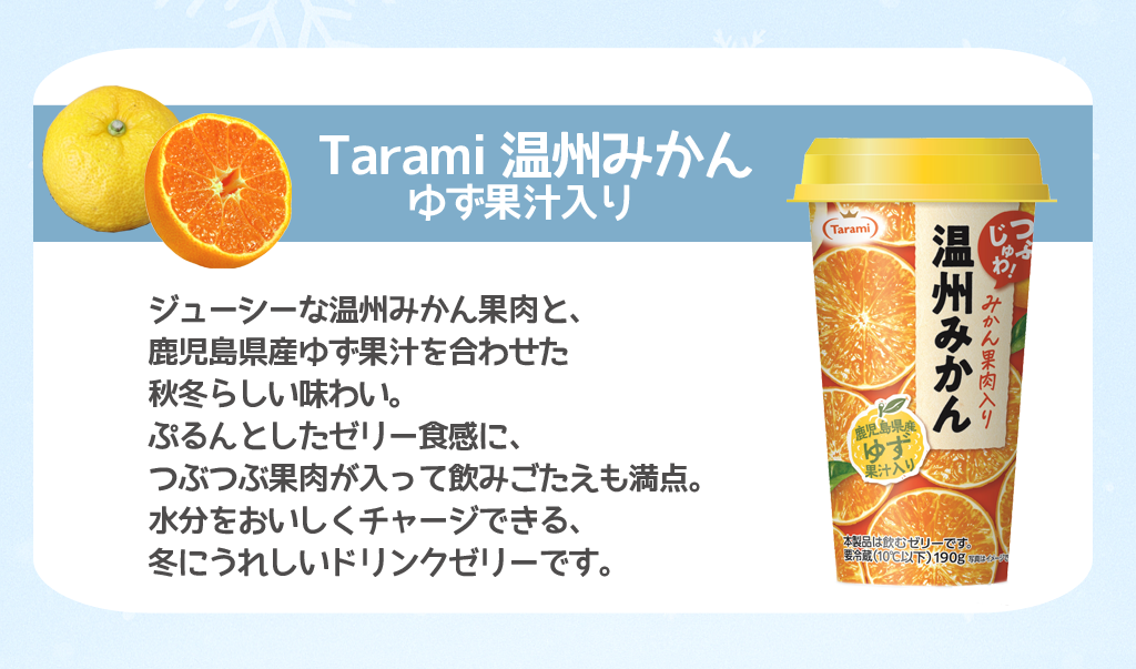 ![]() 7 件中 1-7 件表示 【送料込み】たらみ ドリンクゼリー Tarami 温州みかん ゆず果汁入り 190g 30本セット ドリンクゼリー ※クール便(冷蔵)・同梱不可 ※北海道・沖縄・離島へのご注文は承っておりません。※代金引換不可 ※日にち指定不可