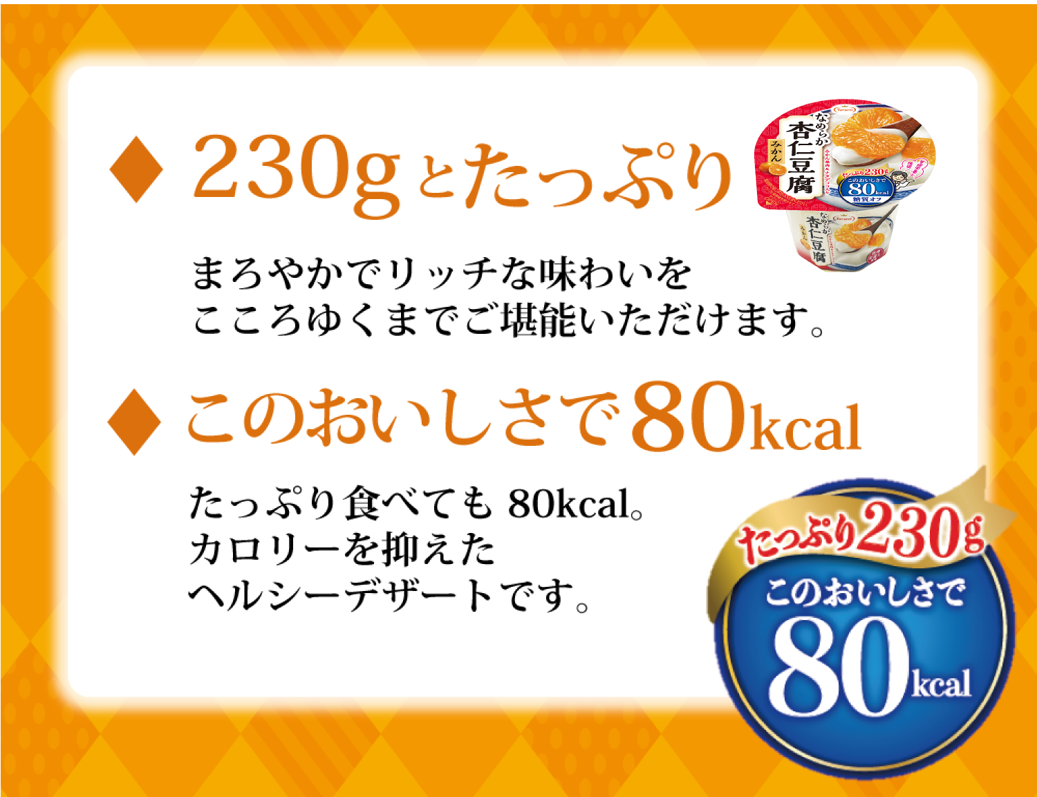 80kcal・糖質オフで楽しめる、コクのあるなめらか杏仁豆腐の美味しさ。みかん果肉入り。 口あたりの良いなめらかな食感に仕上げ、まろやかなクリーム感のあるコク、 華やかな杏仁の香りが楽しめる、みかん果肉入り杏仁豆腐です。 ジューシーなみかん果肉と、コリコリっとしたナタデココとともに、まろやかな杏仁豆腐のリッチな味わいが楽しめます。 たっぷり230g食べても、80kcalで、 さらに糖質もオフ(※1)。管理栄養士推奨(※2)の杏仁豆腐です。 0kcalの糖質(エリスリトール)を使用しています。 (※1)たらみのどっさり杏仁豆腐みかんと比較して、糖質を39%カット (※2)全国医療機関400施設の管理栄養士アンケート調査/2024年3月実施 間食の習慣がある方に紹介したいと96%が回答。(株)ファンデリー調べ ■原材料名:ナタデココ(フィリピン製造又はタイ製造)、みかん(果実、果汁)、エリスリトール、植物油脂利用食品(乳成分を含む)、グラニュー糖、杏仁霜(アーモンドを含む)、塩、寒天/ゲル化剤(増粘多糖類)、香料、乳化剤、酸味料、酸化防止剤(ビタミンC)、甘味料(アスパルテーム・L-フェニルアラニン化合物、アセスルファムK、スクラロース) ■内容量:230g ■賞味期限:製造日より6ヶ月(未開封時) ■保存方法:直射日光、高温多湿をさけて保存してください。 ■使用上の注意: 開封時の液こぼれにご注意ください。 カップ上面部縁を押さえて やさしくOPEN 開封後は、お早めにお召し上がりください。 果実のスジや皮の一部、種子が入ることがあります。 小さな褐色の粒はみかんの種です。 離水することがありますが、品質には問題ありません。 ■栄養成分値(1個230g当たり):熱量80kcal、たんぱく質0.2g、脂質3.2g、炭水化物25.8g(糖質24.9g、食物繊維0.9g)、食塩相当量0.2g ■アレルギー物質:乳、アーモンド